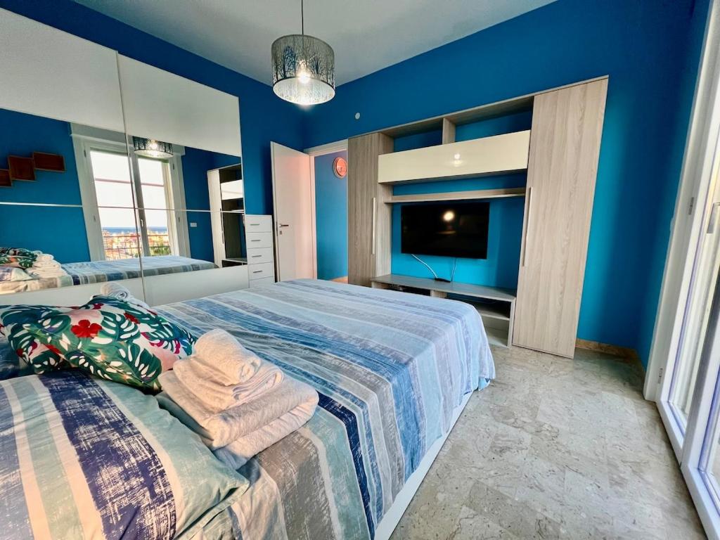 No centro do apartamento, os arquitectos criaram uma espécie de “caixa” autónoma, revestida em azul, que reúne várias funções essenciais: arrumação, áreas técnicas e, em alguns casos, elementos de apoio à cozinha ou à zona social. Em vez de paredes estáticas a dividir o espaço, a Blue Box funciona como um núcleo compacto em torno do qual os restantes ambientes se organizam.