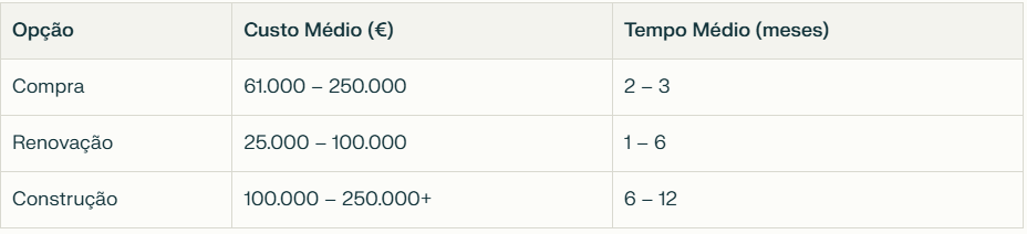 - Renovação: O custo varia conforme a dimensão da obra. Com médias de 25.000€ a 100.000€. E o tempo pode ir de algumas semanas a vários meses. Dependendo da complexidade da renovação.